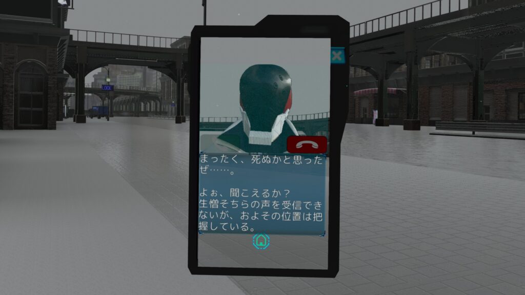 まずは『署長代理』を名乗る女性に無実を証明するために先ほど手に入れた名刺を彼女に見せましょう。右スティックを下に長押し後で出る端末から先ほど手に入れた名刺を呼び出し、彼女の前にある青い円柱状のエリアまで持って行きます。