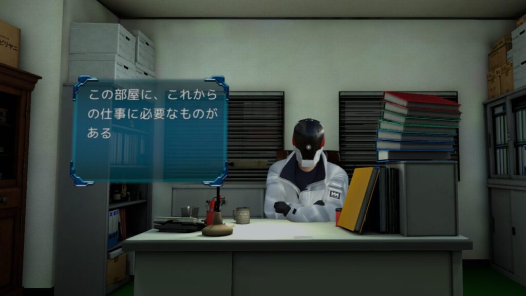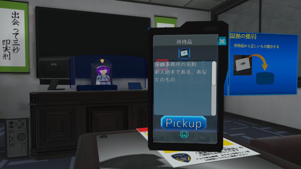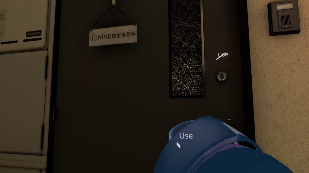 中に居る探偵から「この部屋の中に、これからの仕事に必要なものがある」と言われるので、右スティックを下に長押し(デスクトップモードだとMボタン)で出る「探偵の目」を使って探しましょう。机の上に名刺がハイライトされるので取ると物語が進展し、オープニングムービーが始まります。