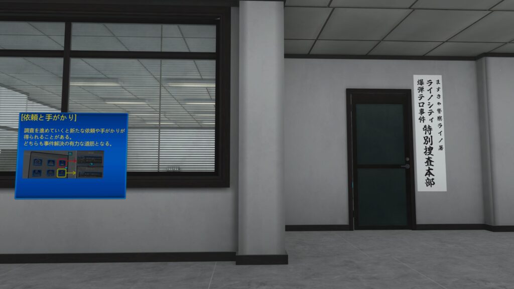 署長室を出た後、目の前の階段を降りると捜査本部の部屋が見えます。中に市街地の地図があるので情報収集しておきましょう。