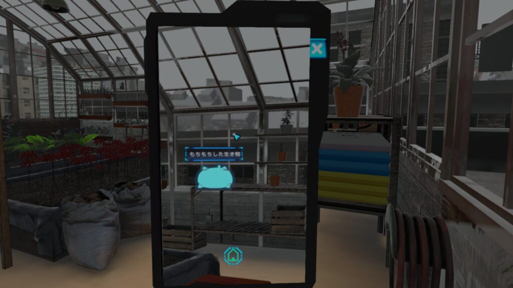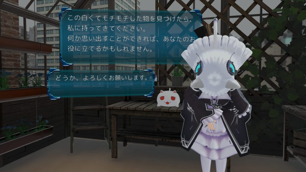 矢印に従ってたどり着いたマンションの屋上に上がると、左手側にある温室に依頼者らしき『ますきゃっと』が居ます。が、どうやら記憶喪失になっている様子。ここで、温室の中にある白くてもちもちした生き物を彼女の頭の上(の青いエリア)に置くと……?