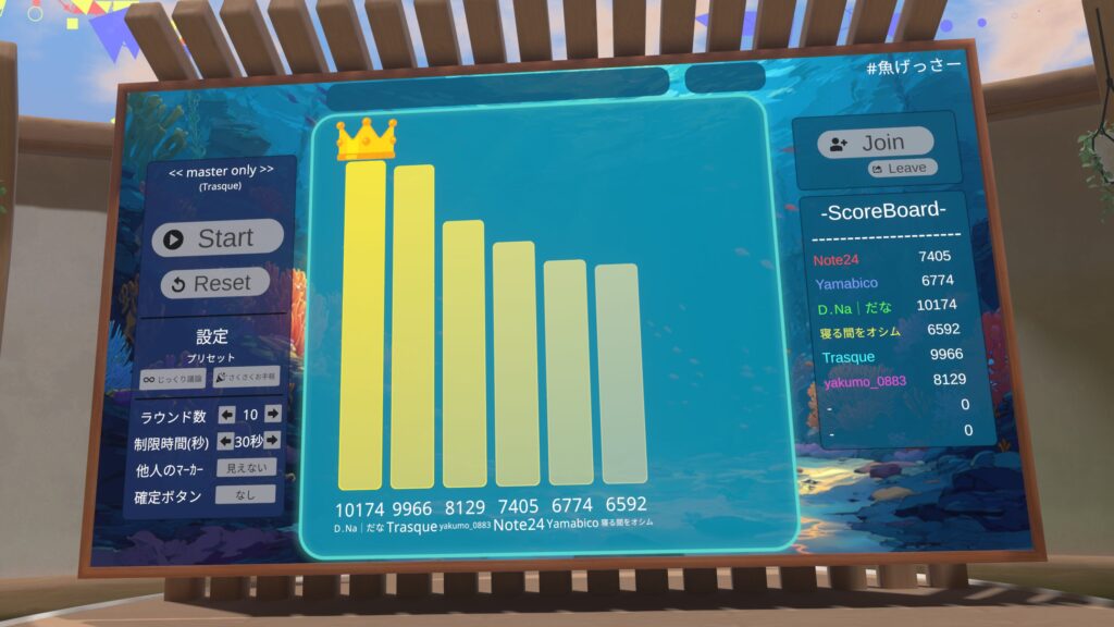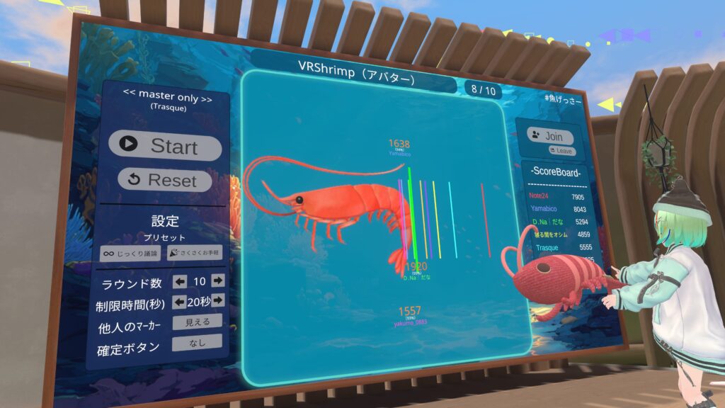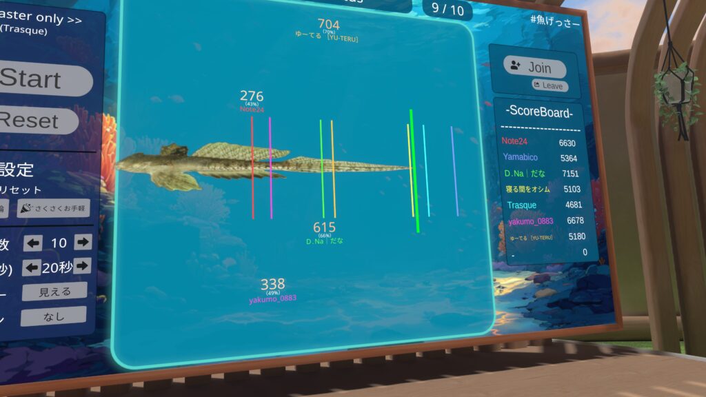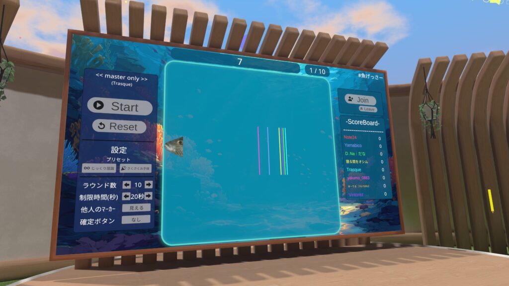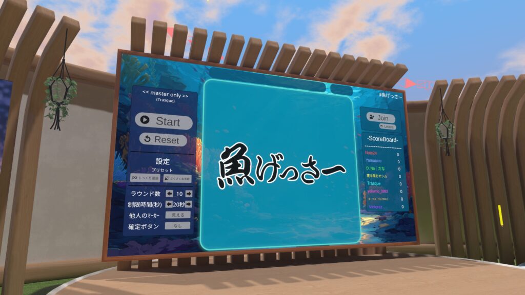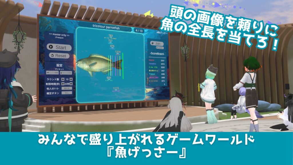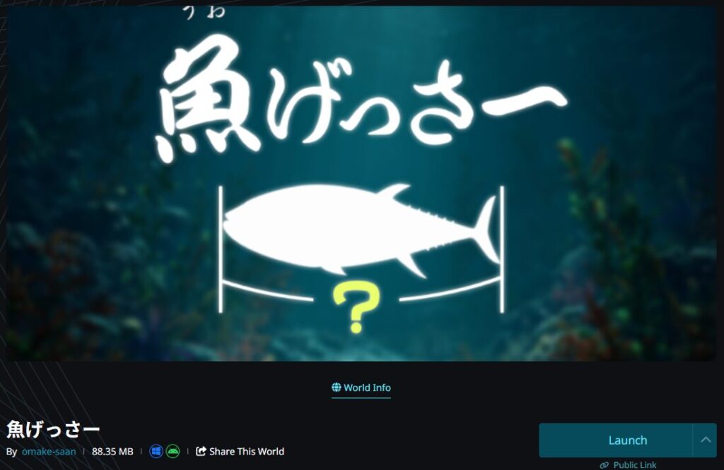 今回ご紹介する『魚(うお)げっさー』は、YouTubeのオモコロチャンネルの動画『新時代のギャンブル「魚長さチキンレース」が想像以上に盛り上がった!!』を元ネタに、VRChatで遊べるゲームワールドとして制作されたワールドです。