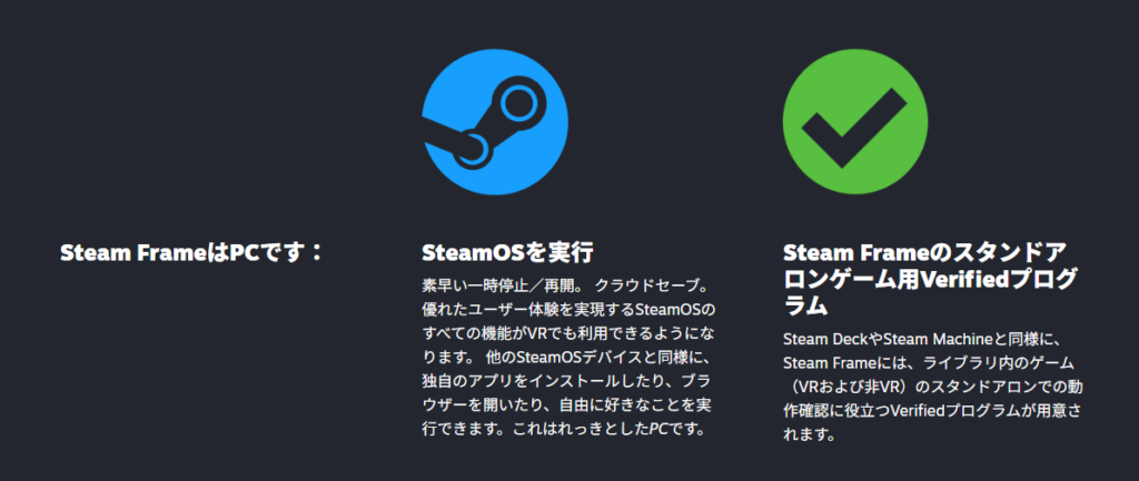 2025年11月13日、Valveは新型VRヘッドセットの『Steam Frame』、ゲーミングPCの『Steam Machine』、そしてコントローラーの『Steam Controller』を発表しました。特に『Steam Frame』は久しぶりのVR特化型のデバイスであり、何よりもVRの老舗ともいえるValveから出るという事で、話題になっています。