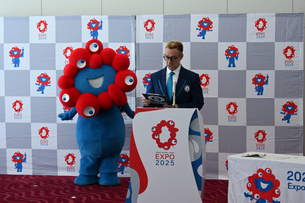 大阪府咲洲庁舎(さきしまコスモタワー)にて行われた認定証授与式では、ギネスワールドレコーズジャパンの公式記録認定員、ジャスティン・パターソン氏より、博覧会協会事務総長の石毛博行氏へギネス世界記録認定証が授与されました。ミャクミャクもお祝いに駆けつけ、愛くるしい姿で授与式を盛り上げてくれました。