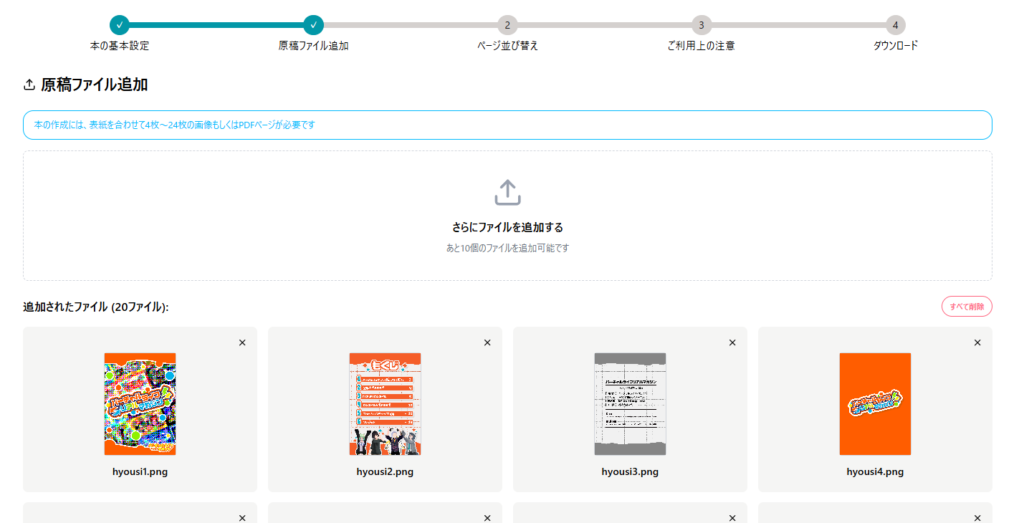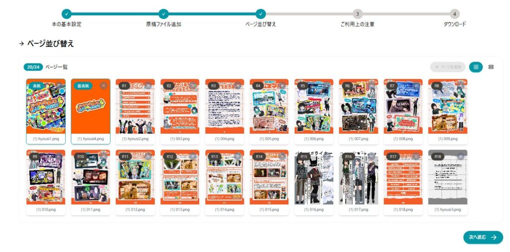 ページを並び替えて、問題がなければ次に進んで規約に同意します。ここまで直感的に操作できたので、迷わず制作を進められました。
