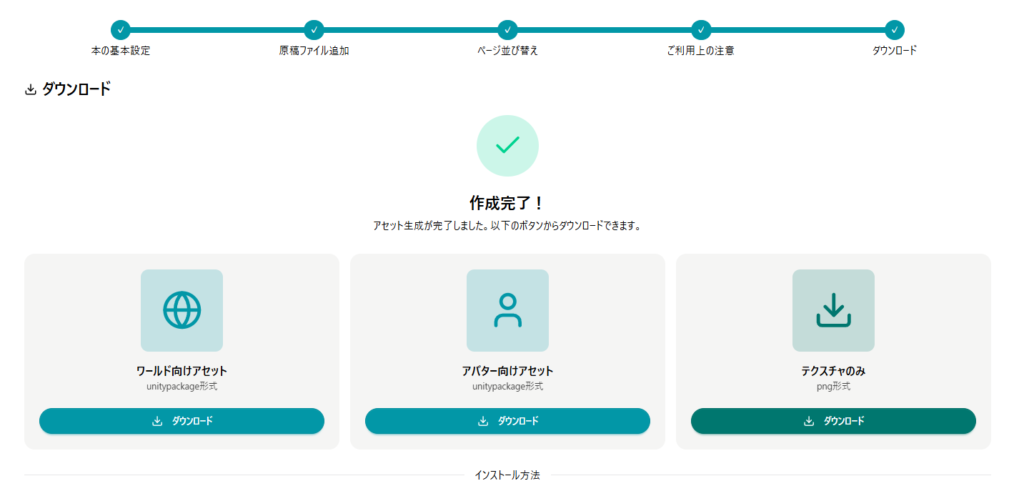ワールド向け、アバター向けのアセットが生成されるので、使用する任意のパッケージをダウンロードします。