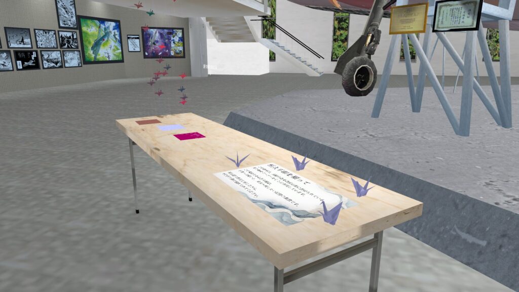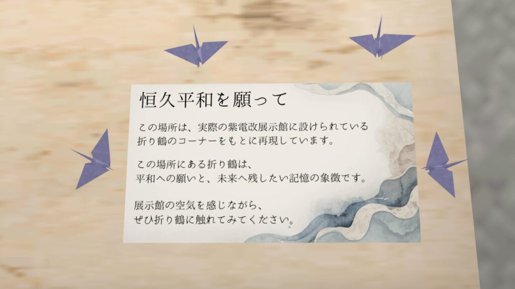 折り鶴は「平和への願い」「未来へ残したい記憶」の象徴とされています。置いてある折り紙には、実際に鶴を折れるギミックも。