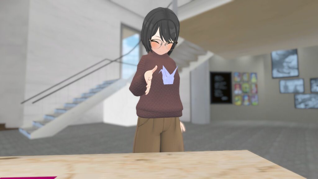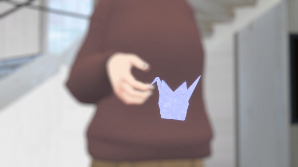 上手く折れたら、隣にあるコーナーから折り鶴をお供えしましょう。折り鶴を持った状態で近づけば、パーティクルが現れると同時に折り鶴が天へと昇っていきます。