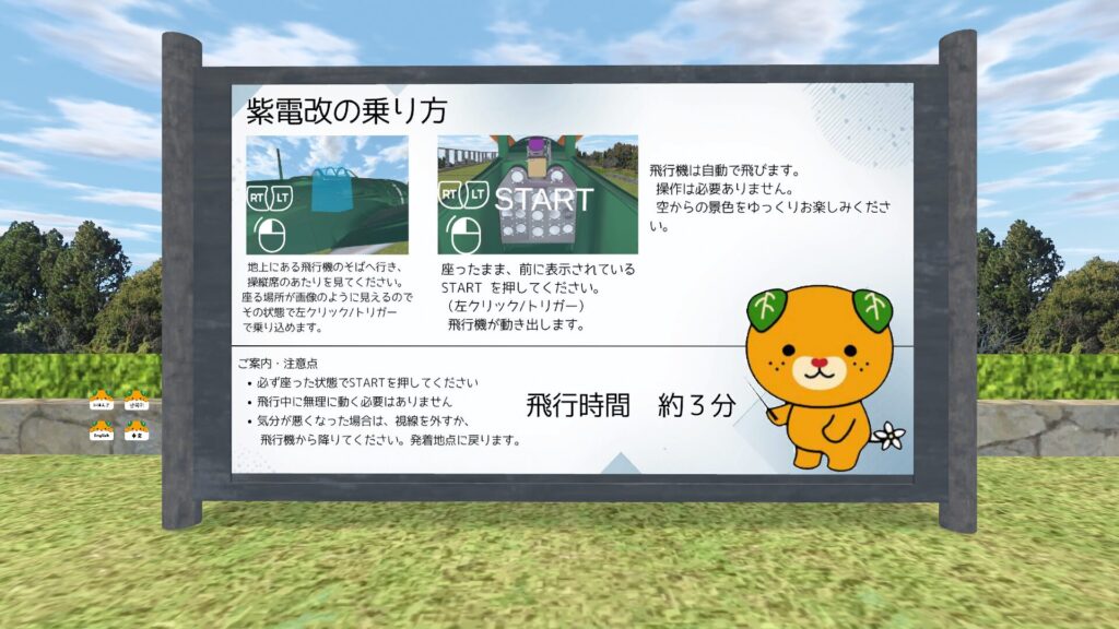 そばには乗り方の説明も。難しい操作は一切なく、搭乗さえすれば後は自動操縦で誰でも空の旅を楽しめます。