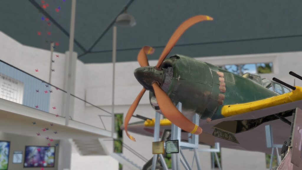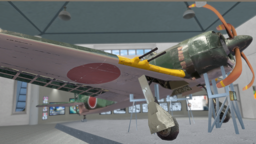 実際の展示館は紫電改周辺に柵が設けられており、近づける距離には限りがあります。至近距離で眺めたり、翼に乗ったりすることすらできるのは、VRならではの大きな魅力です。