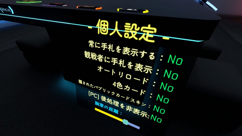 ワールド内に2つ設置されているテーブルの隅には、プレイに関する個人設定や他プレイヤーに所持金を分け与えられるギフトカードなどがあります。