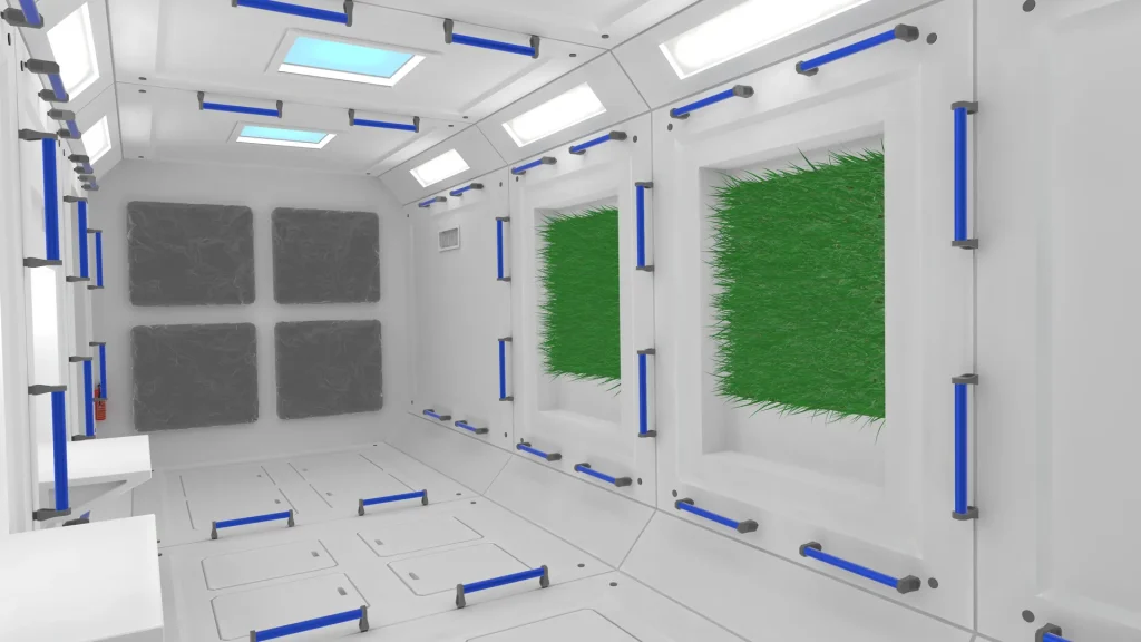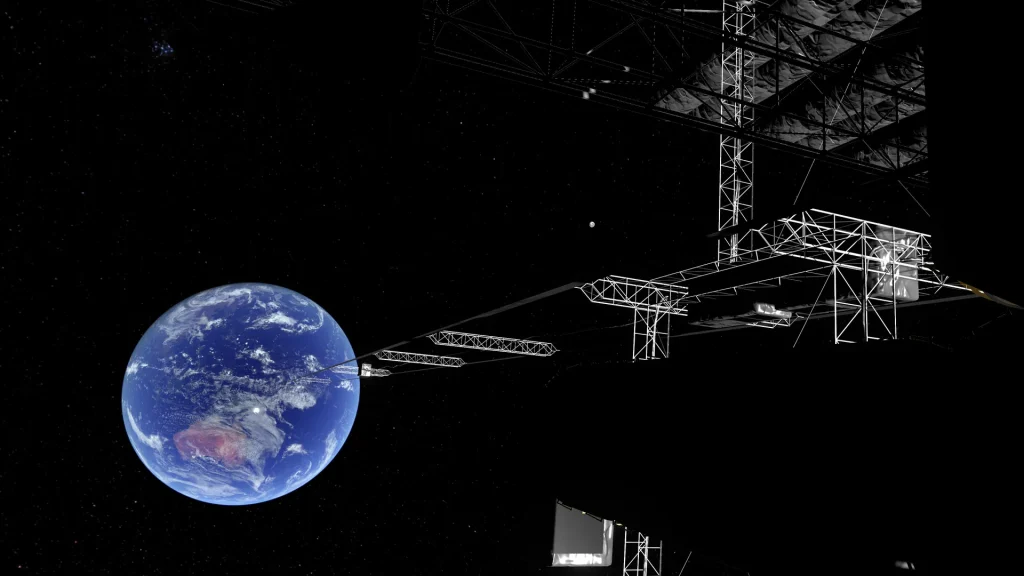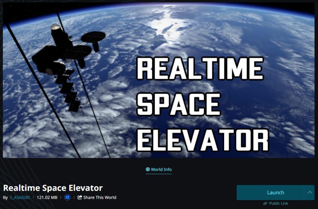 実時間に合わせて動く軌道エレベータ。各フロアにはお部屋があり、まったり過ごすことができる。地球が正面になったり、足元にいたりといった配置が宇宙ならでは。10倍速やワープがあるので気分に合わせて移動できます。(おしむ)