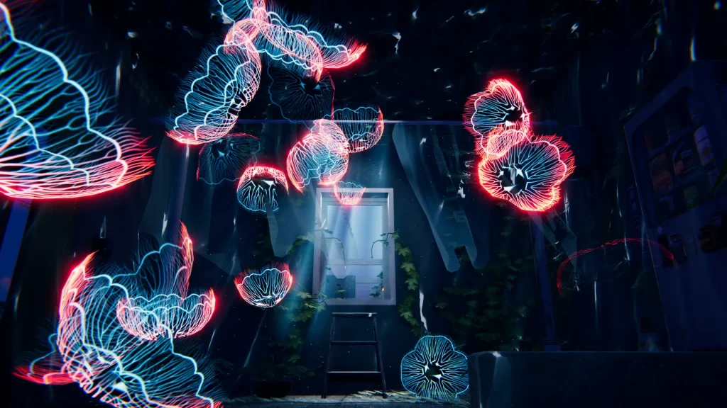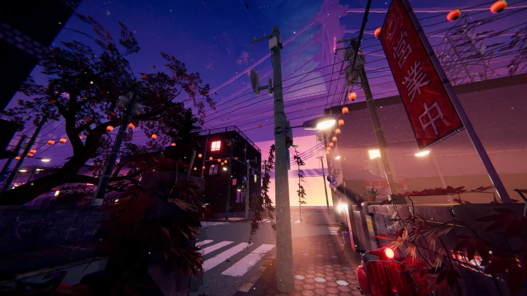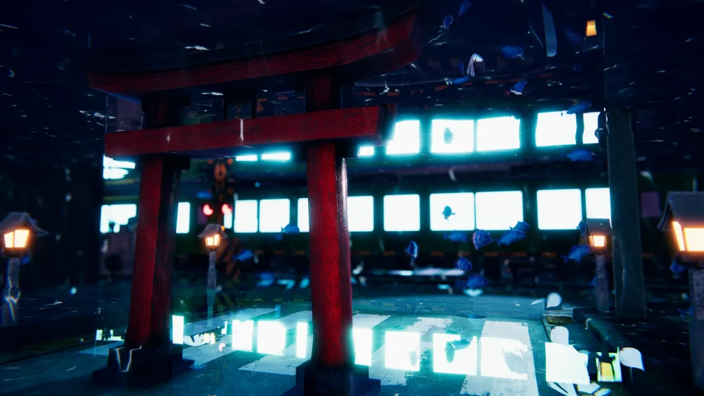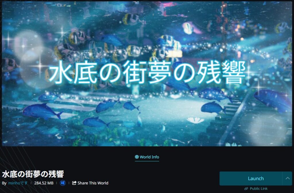 夕日か朝日が差し込む海沿いの街のワールドです。マンホールに触れると街が水没し、無数のランタンが空を舞う幻想的な景色になります。鳥居と色とりどりの魚の組み合わせがきれいな水中の景色も必見。(やまびこ)