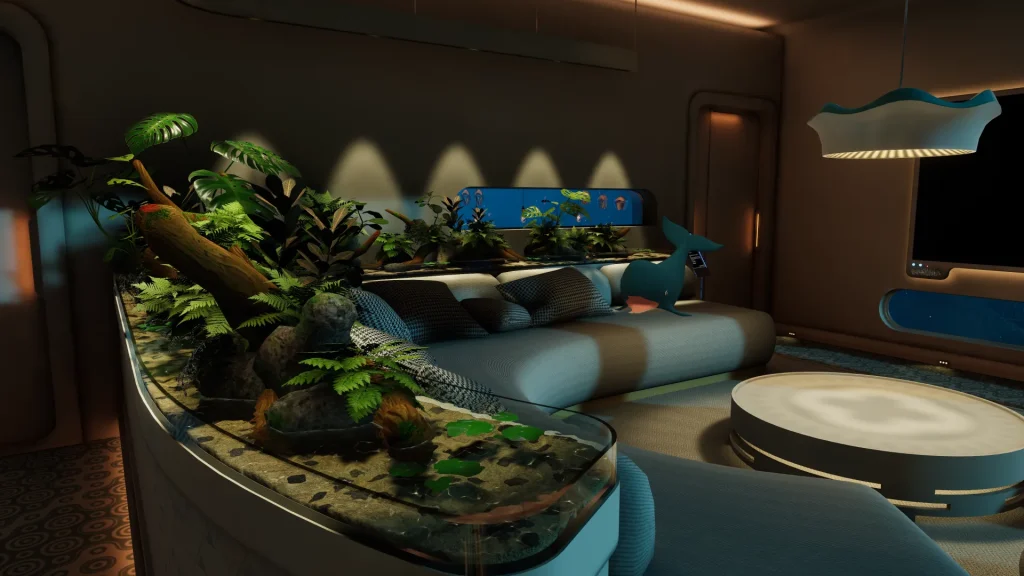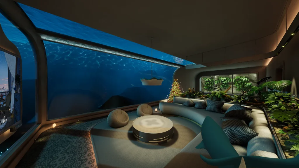 海中にあるチルワールドです。ジンベイザメやマンタが泳ぐ海がよく見えて、開放感がすごい! 隠れ家感のあるバーも雰囲気最高です。(やまびこ)