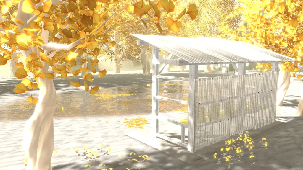綺麗なイチョウの木が並ぶワールド。風景を楽しみながらチルも出来る素敵なワールドです。(Ryoku)