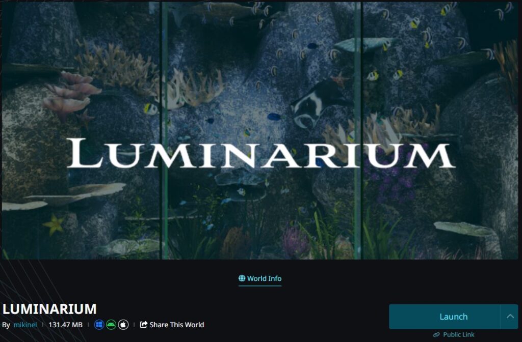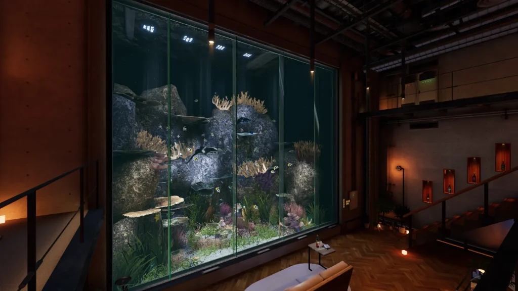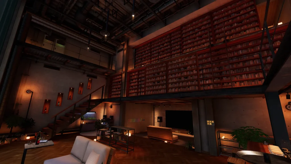 アクアリムと本棚が特徴的なワールド。秘密基地みたいに本棚が開くので楽しい。ポストプロセスの調整もできるのでただ過ごすだけでなく撮影などにも使えます。(おしむ)