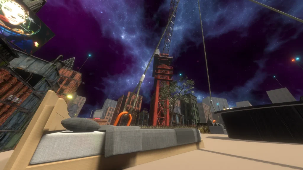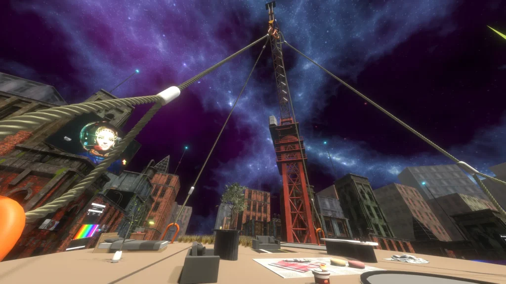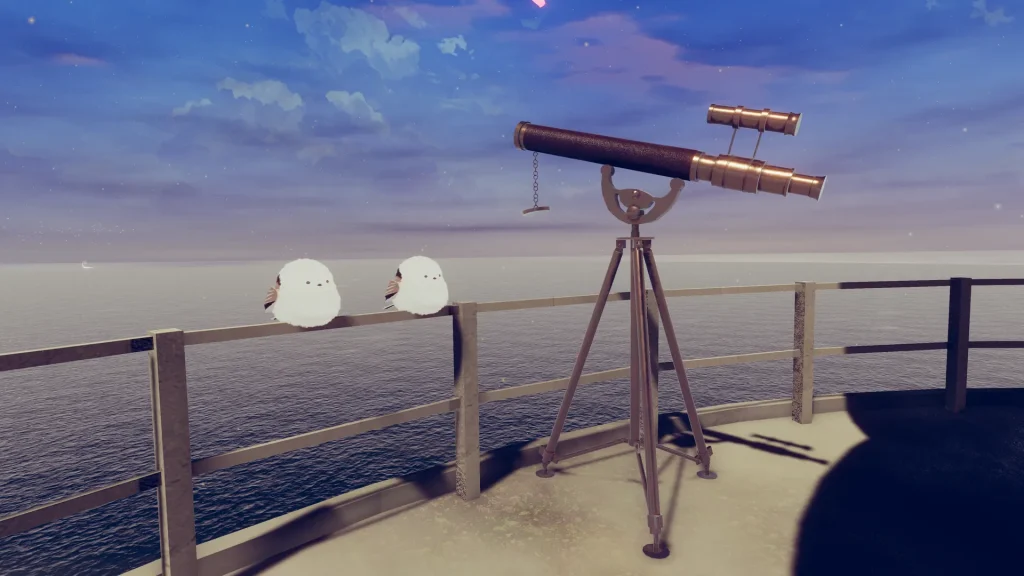 満天の星空のした、360度のパノラマが楽しめるこの部屋は、よく見ると上からクレーンで吊られています。部屋の端の方に行くと、天秤のように部屋が傾きゆらゆらと揺れます。チルできそうでチルできないかもしれないワールドです。(やまびこ)