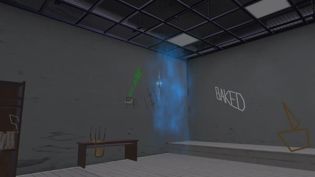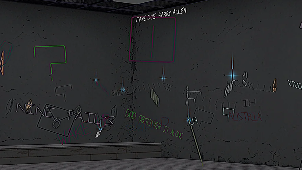 何もないお部屋ですが、しばらくするとゴーストが来て色々なことを書き始めます。どこかで見たことあるようなキャラクターや、鏡文字を書く猛者も。(おしむ)