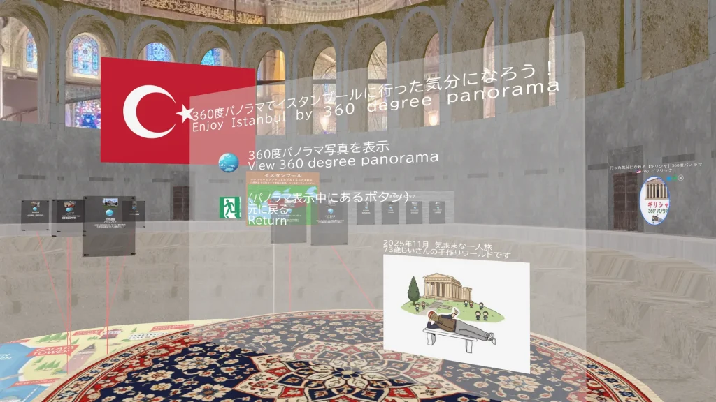 トルコのイスタンブールで撮影した360度写真を、キャプションと共に鑑賞できるワールド。かなり広範囲にわたって撮影されているのと、製作者が73才というのが驚き。ギリシャ版もおすすめです。(おしむ)