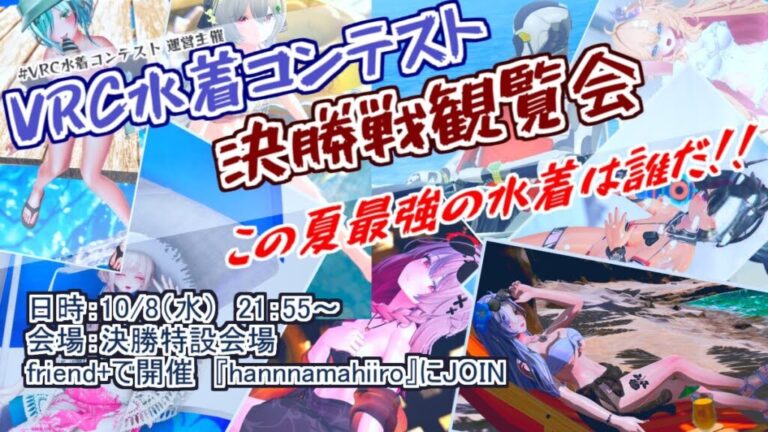 8/25より募集を開始し、115ものたくさんの応募があった第五回VRC水着コンテスト!ついに8人のファイナリストも決定し、決勝戦が10/8(水) 21時55分より行われます。決勝戦では、ファイナリストのアピールタイムを行 … 続きを読む 第五回VRC水着コンテスト決勝戦開催!観覧者募集【寄稿】