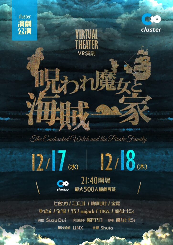 VRChatで公演されたVR演劇「呪われ魔女と海賊一家」がclusterでも!12月17日(水)と18日(木)の2回にわたって公演されます!開場時間はどちらも21時40分から!