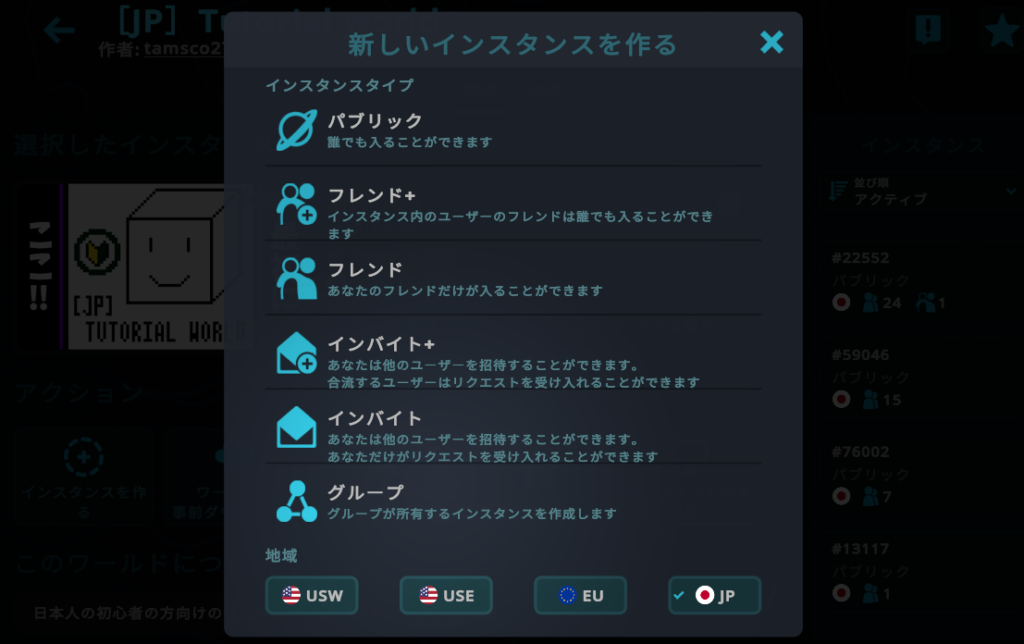 気になるワールドをクリックするとワールド詳細が表示されるので、入るをクリックするとワールドに移動します。サムネイル左下のインスタンスを作るをクリックすると新しいインスタンスを作成することができます。