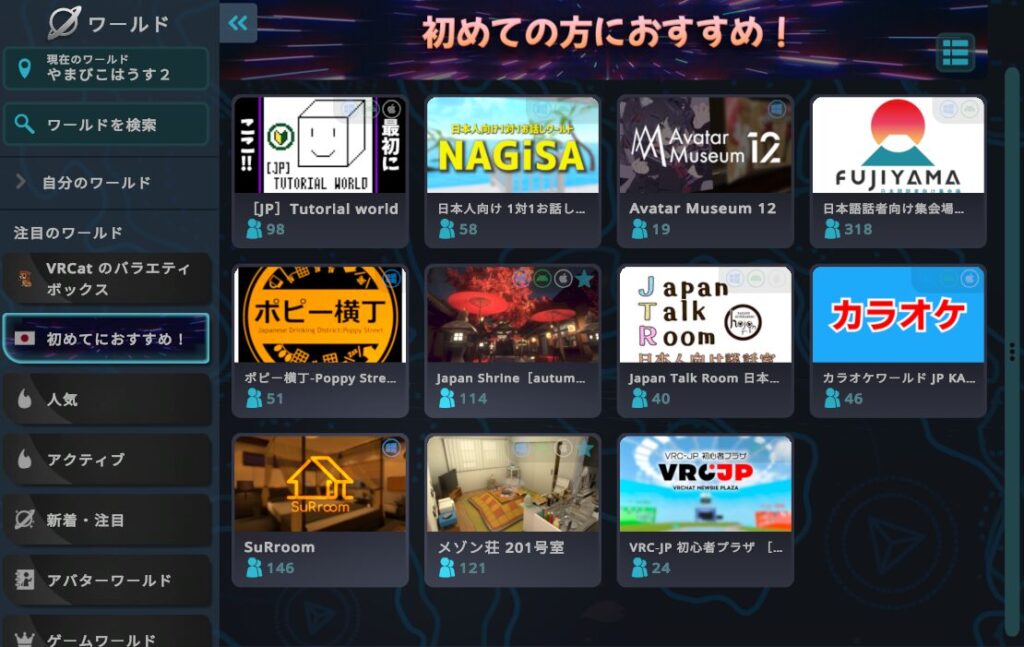 『初めてにおすすめ!』タブは、日本の初心者ユーザー向けおすすめワールドがピックアップされています。