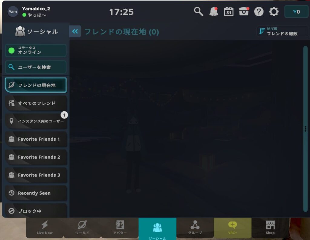 相手がリクエストを承認した場合、ソーシャルメニューのフレンド一覧に表示されるので、イベントの際はそのユーザーを選択しアクションから『入る』を選択すると、そのユーザーがいるインスタンスへ向かうことができます。