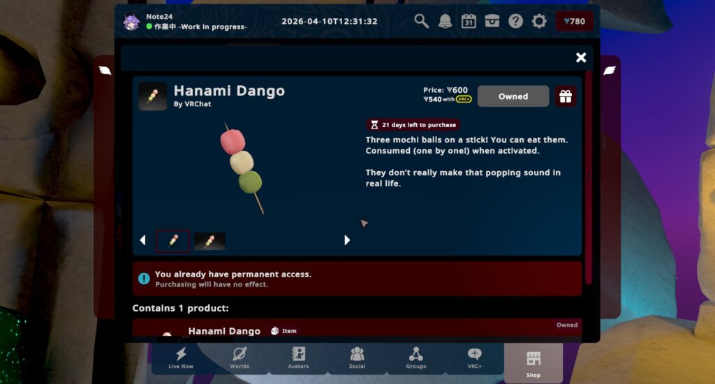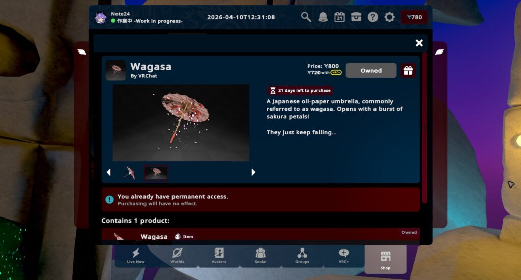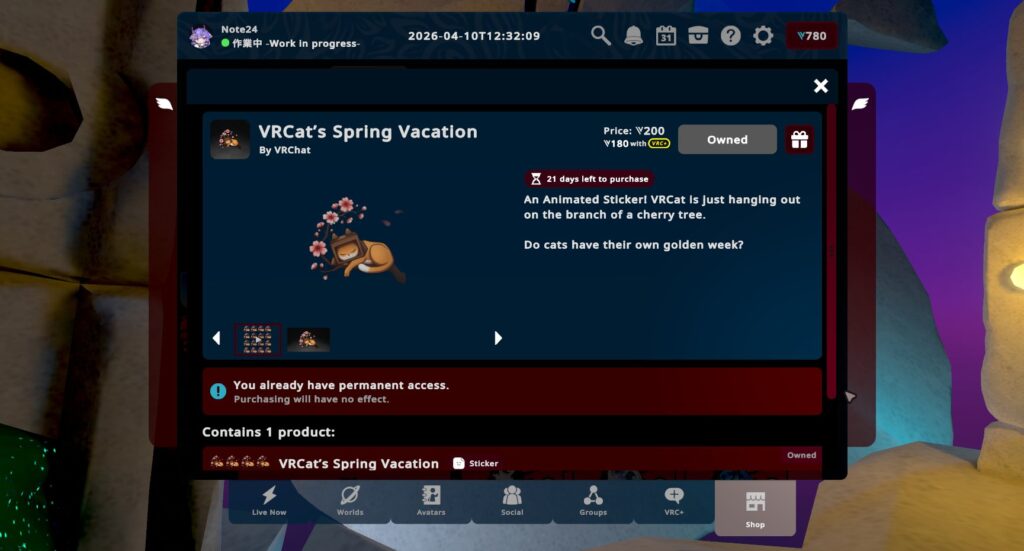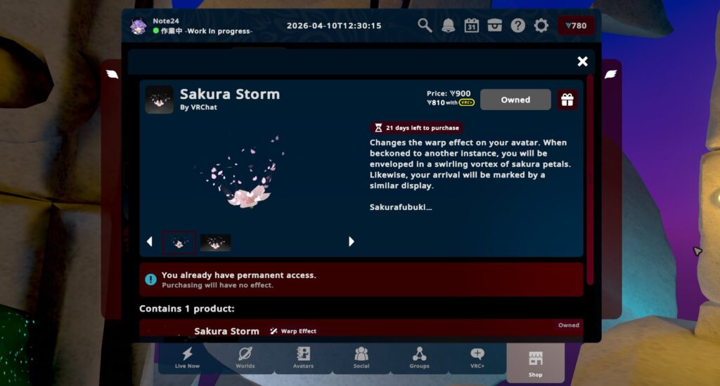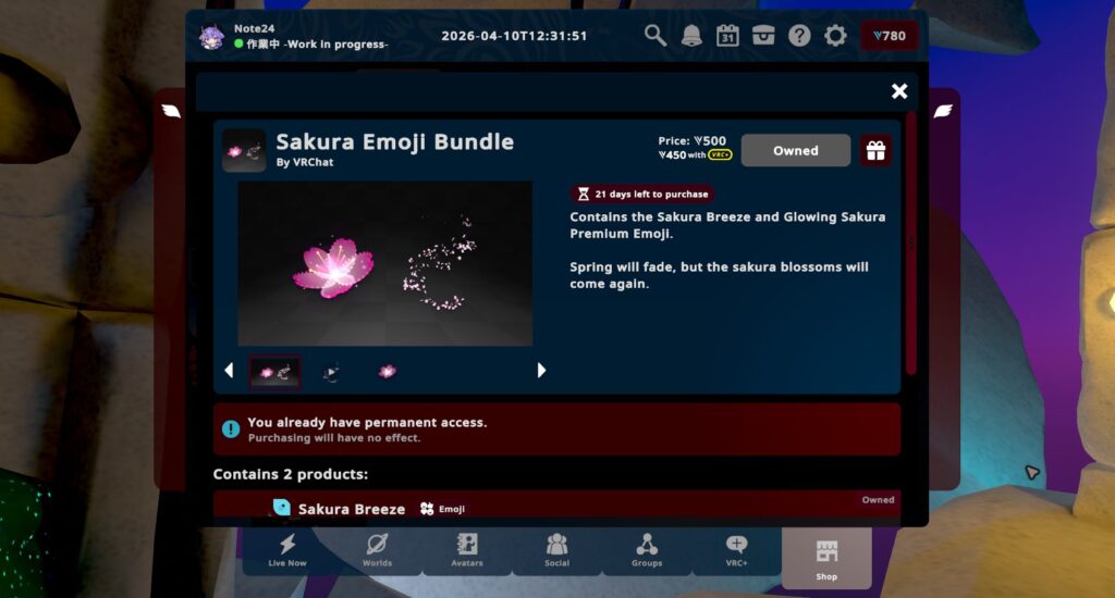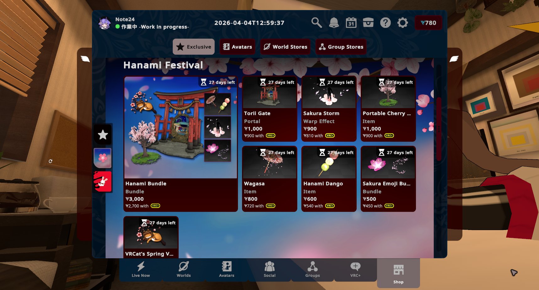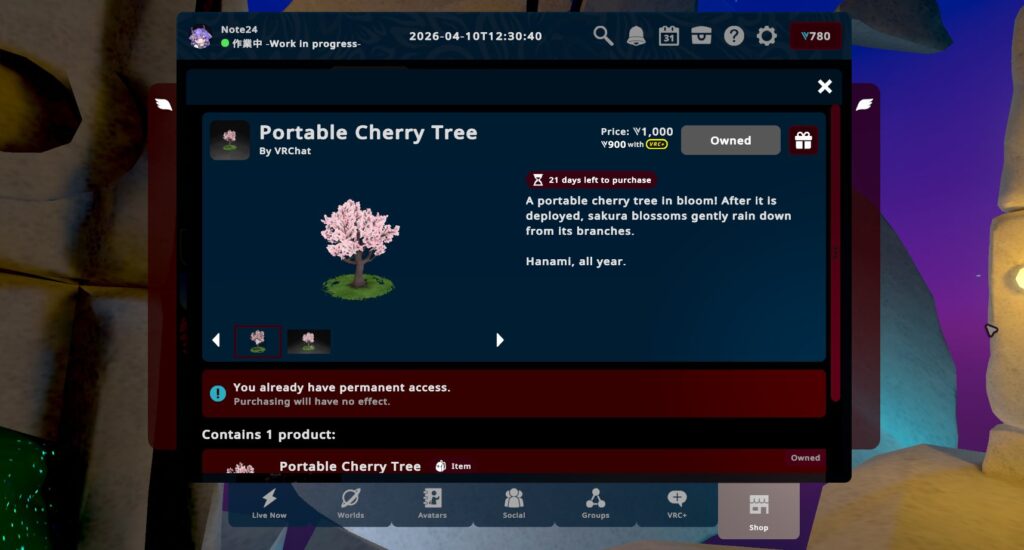 VRChatは4月4日朝、お花見をテーマにした新しいアイテムをショップに公開しました。