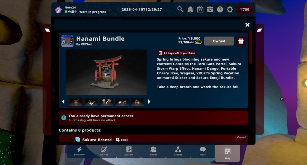 個別に買って全部集めると5,100VCですが、紹介したすべてが詰まったお得なバンドル「Hanami Bundle」を購入すれば、3,000VCとお買い得に!VRC+ユーザーならさらに10%オフ!