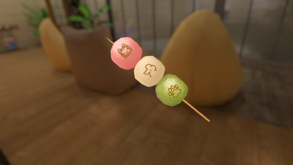 「VRCat」「VRRat」「肉球」の焼印がされており、とってもかわいい!筆者が個人的に一番好きな団子でもあります。