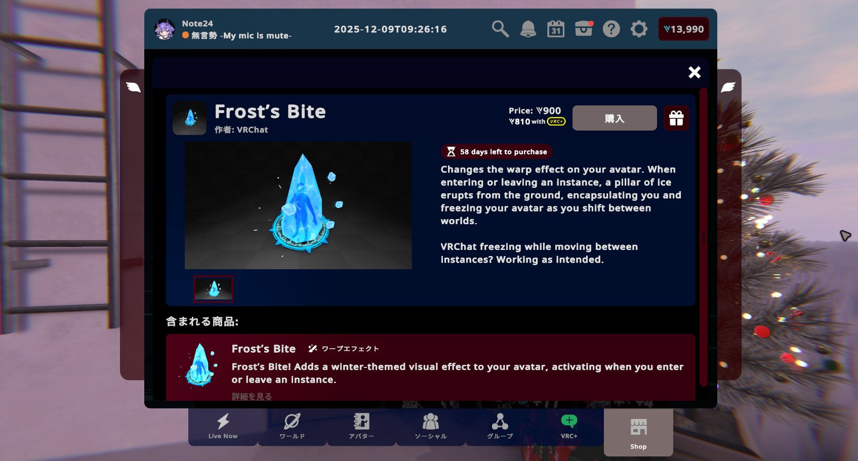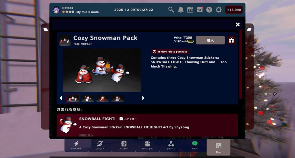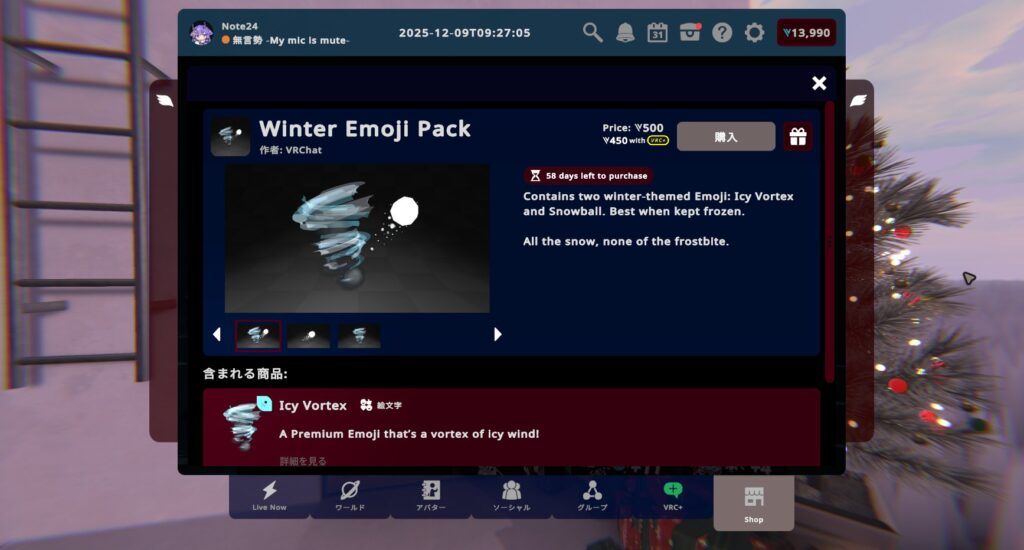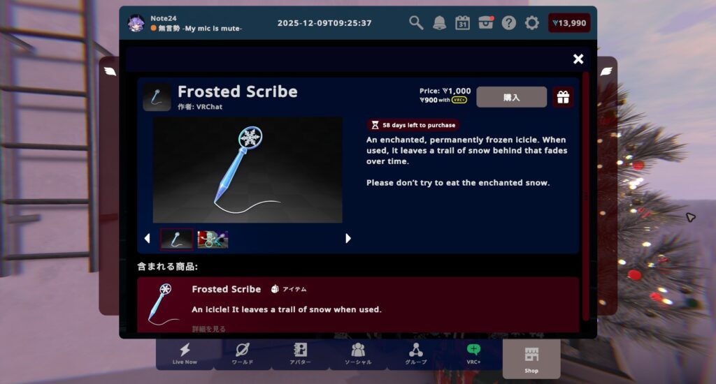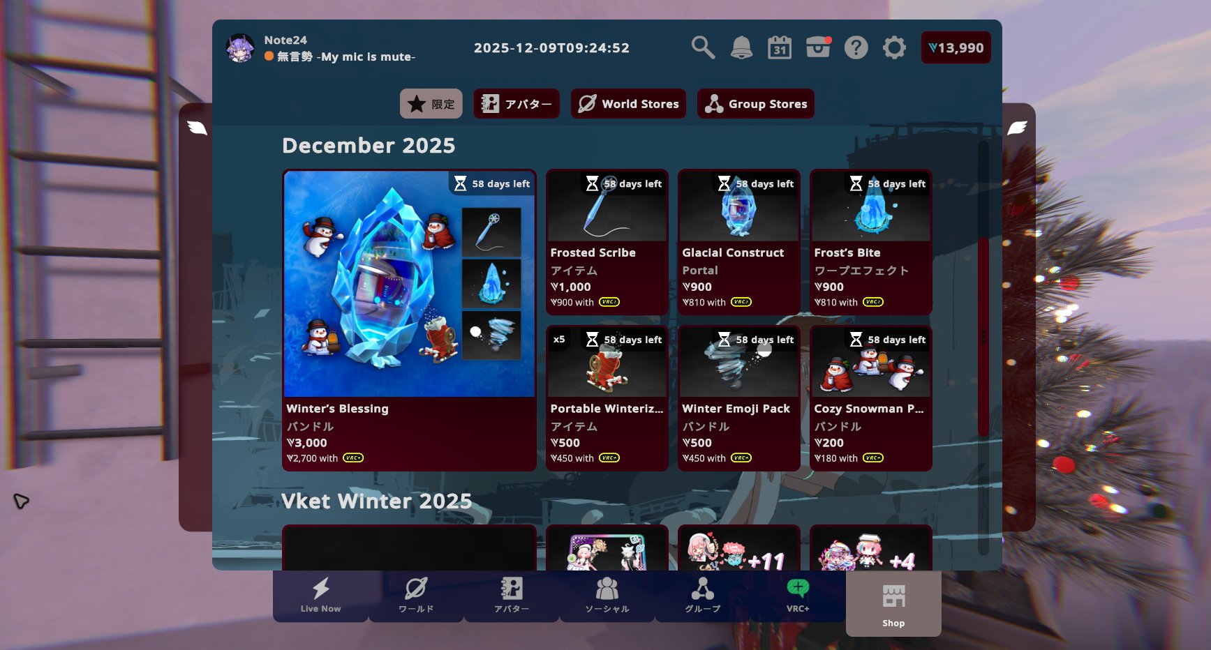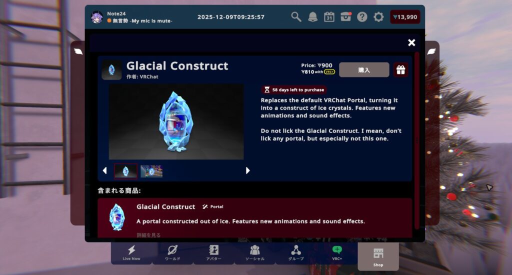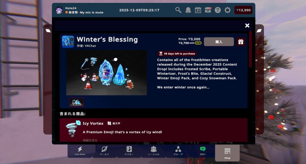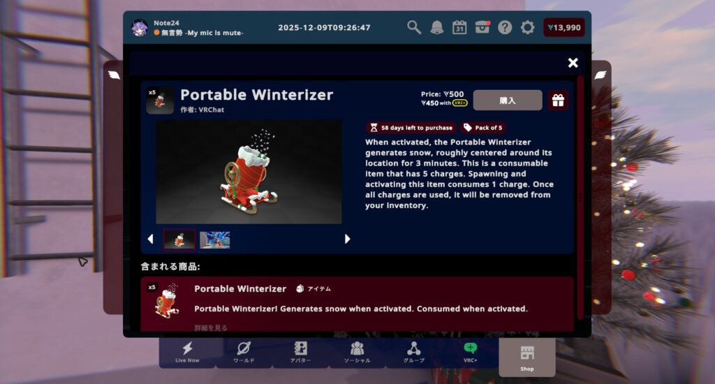 VRChat2025年12月12日ホリデーシーズンがやってきた!どこでも冬を満喫できる、ひんやり冷たいアイテム盛りだくさん!【VRChat:マンスリーショッピング】