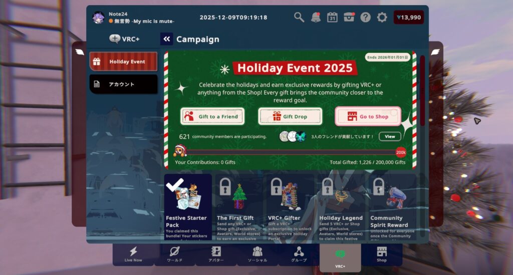 VRChatでは、1月1日(JST)までの期間で「HOLIDAY EVENT 2025」というキャンペーンを実施。