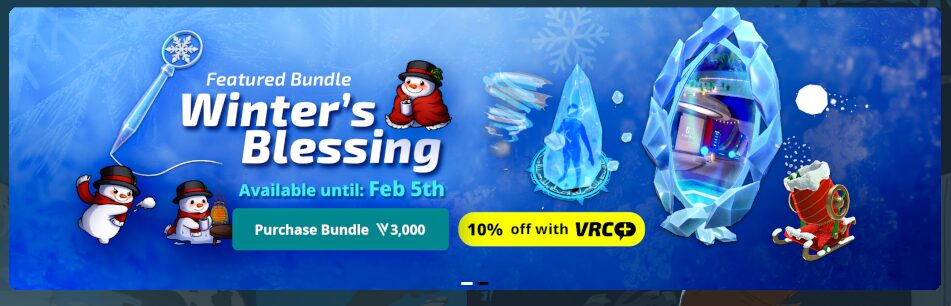 個別に買ってすべて集めると4,000VCですが、紹介したすべてが詰まったお得なバンドル「Winter’s Blessing」を購入すれば3,000VCとお買い得に!VRC+ユーザーならさらに10%オフ!