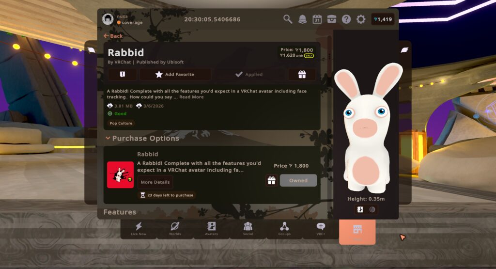 まず最初に紹介するのはマンスリーアイテムとしては初のラインナップ追加となるアバター『Rabbid』。クロスプラットフォームに対応しており、PC版だけでなくAndroid/iOS版VRChatにも対応したアバターとなっています。アバターランクはPC版でGood、Android/iOS版でMediumとなっているためVRChatを遊んでいるすべてのユーザーが使えるアバターとなっています。