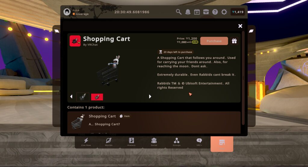 今回のラインナップで一番注目のアイテムがこちら。アバターの後ろについてくるただのショッピングカートとしてだけではなく、なんとカゴの中にSit判定が付いています。フレンドをショッピングカートに乗せて歩き回る(※酔いには注意)こともできるほか、ワールド巡り中にスタックしたフレンドをSit判定に座らせて救出することもできます!