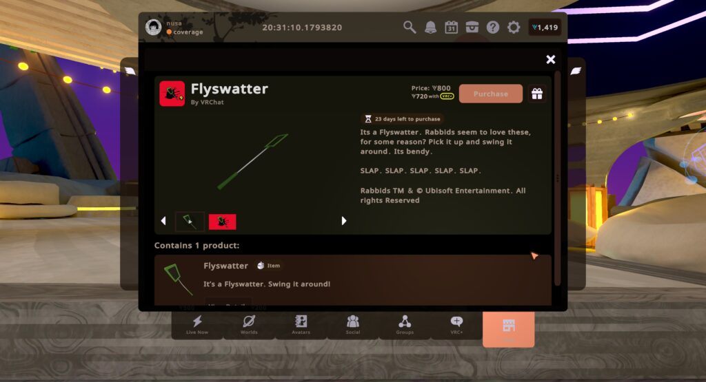 こちらはアバターのボーンに強く当てると痛い音が鳴る『ハエたたき』です。ハエたたきではありますが、ゲーム内ではRabbidsが用いる武器として真面目に使われているようです。バトロワワールドなどでの武器にはなりませんが、ハエや蚊が飛んでいるワールドで振り回しながら探索してみても……?