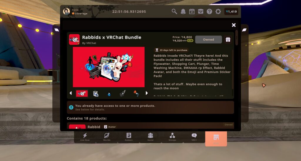 個別に買って全部集めると7,400VCですが、紹介したすべてが詰まったお得なバンドル『Rabbids x VRChat Bundle』を購入すれば2,600VCお買い得に!VRC+ユーザーならさらに10%オフ!