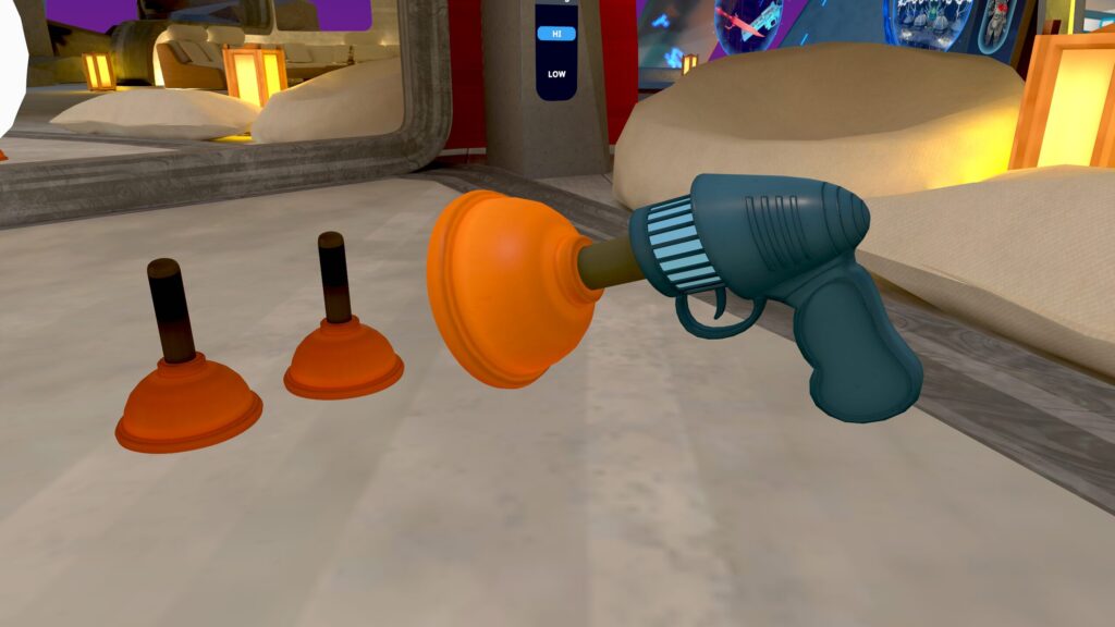 トイレの詰まりを解消する『スッポン』を発射するアイテムです。コライダーに当たるとその場でコライダーに垂直に吸い付きます。最大で2発まで吸い付かせることができ、3発目を打つと1発目が消えていきます。また、発射されたスッポンは時間経過でも消えていきます。発射されたスッポンの持ち手の部分にはPhysboneが入っており、握ると引っ張ることができますが、かなり強固に吸着しているので持つことはできません。ゲーム内ではこれを集めて階段にして脱出するようですが、VRChatの脱出ゲームの解決策にはなり得ないようです。