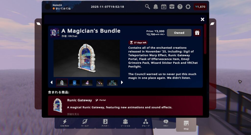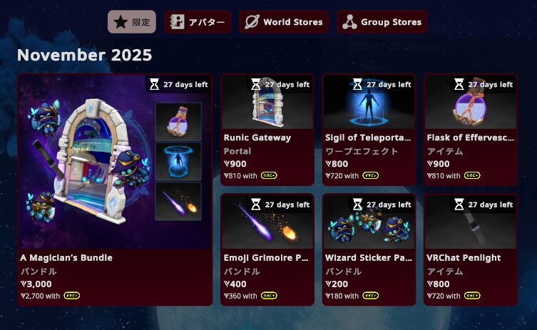 個別に買ってすべて集めると4,000VCかかりますが、紹介したすべてが詰まったお得なバンドル「A Magician’s Bundle」を購入すれば3,000VCとお買い得!VRC+ユーザーならさらに10%オフ!!