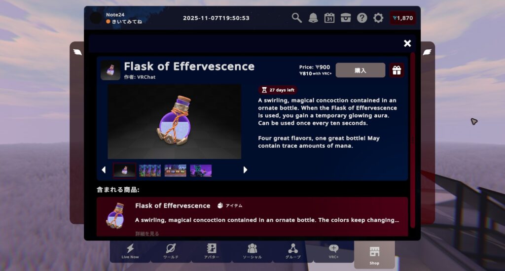 こちらは、フラスコに入ったポーションのような「Flask of Effervescence」。