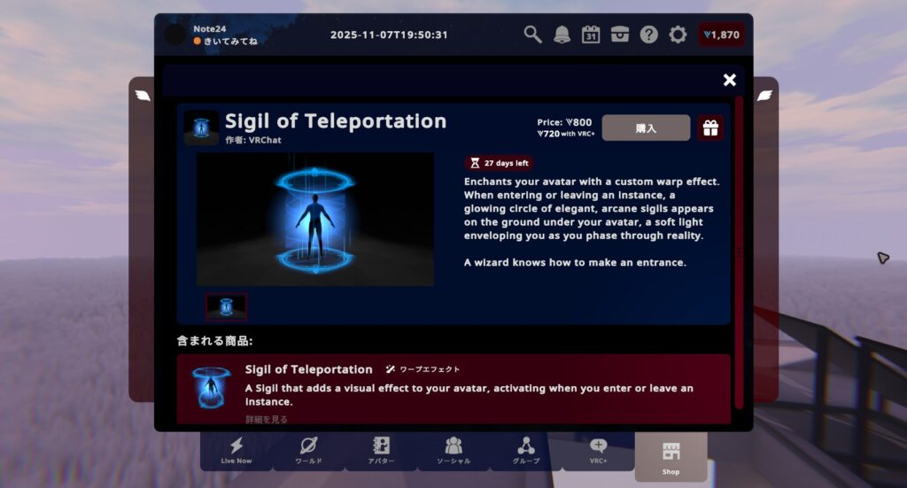 • Sigil of Teleportation:入室/退出時のワープ演出が使えるようになります。
