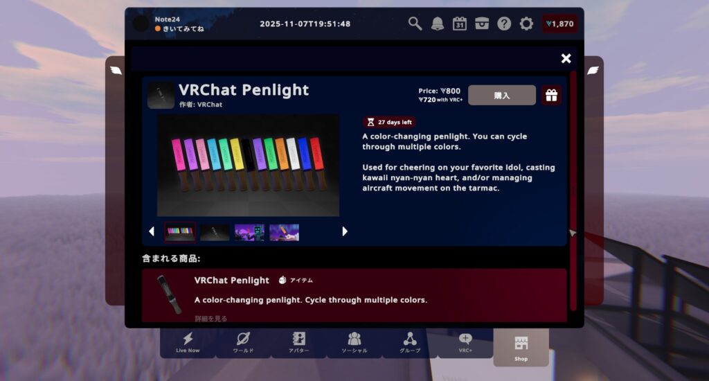 一方変わってこちらはペンライト。何の変哲もない普通のペンライト「VRChat Penlight」です。