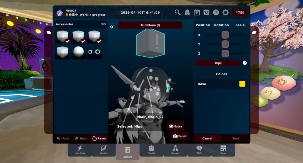 アクセサリーは、位置・サイズの変更をはじめ、追従するボーンの設定や色の変更が可能です。