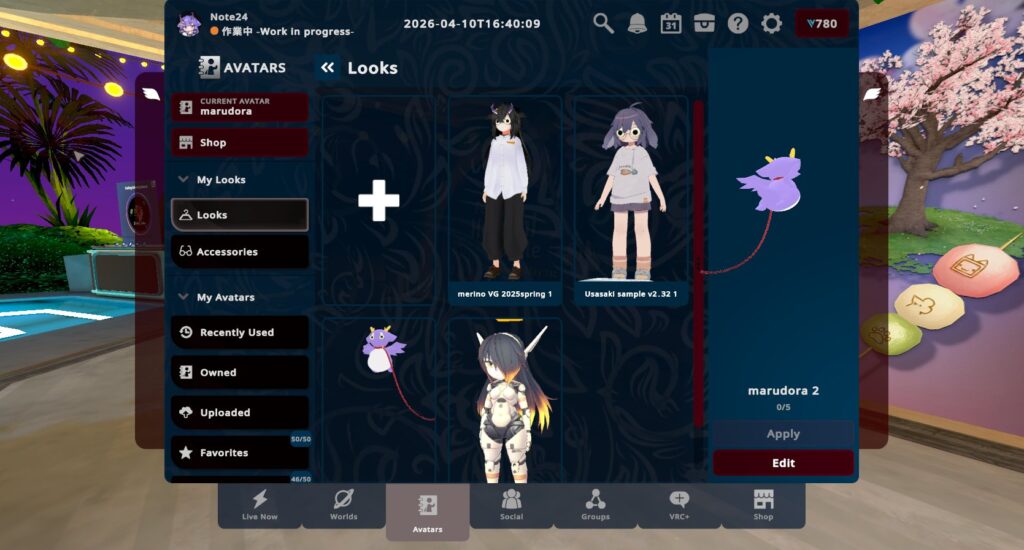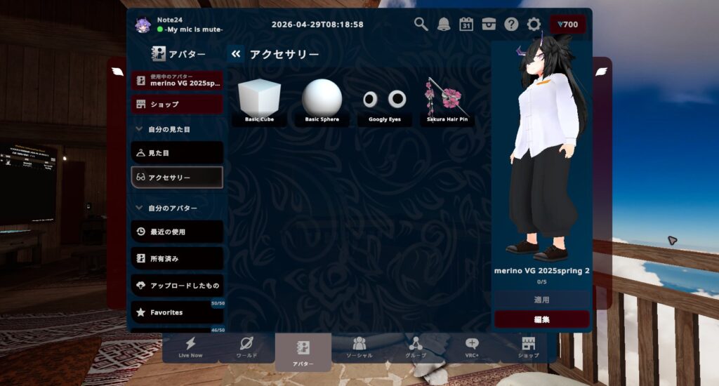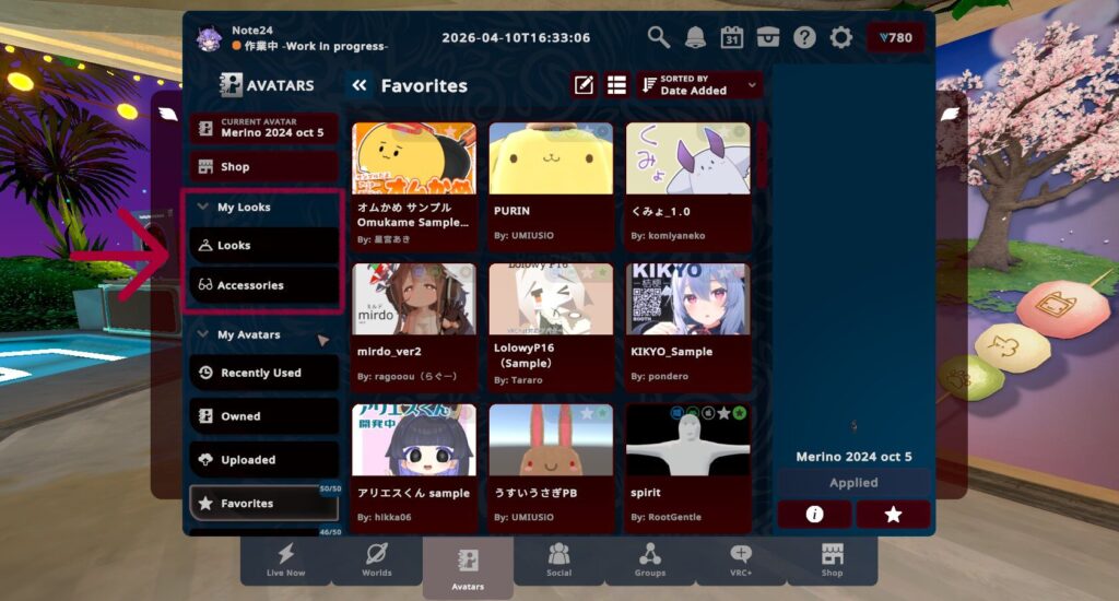 アクセサリーを付け保存することで、アバタータブまたはリングメニューの「見た目」からスムーズにアバターを変更できます。