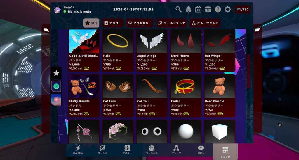 オープンベータ時点では、「Googly Eyes(目玉)」「Basic Sphere(球)」「Basic Cube(箱)」が無料で提供されており、リリース時点ではその3種類に加えて「天使と悪魔(Good & Evil)」「もふもふ(Fluffy)」「桜の花」をテーマにしたアクセサリーが750VC~1200VC(VRC+ユーザーは10%割引)の価格帯で販売。
