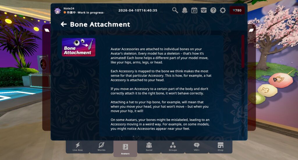 今回実装されたアクセサリーは、まだラインナップが少ないですが、アバターマーケットプレイスのようにクリエイターたちの作ったアクセサリーが展開され、自身のオリジナリティ・アイデンティティの表現をUnityを使わずにVRChat内で完結できるようになる日も近い……?
