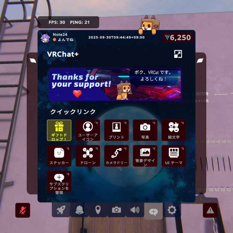 購入して「設置(Drop)」することで、インスタンス内のユーザーに一斉にVRC+をプレゼントすることができる機能です。